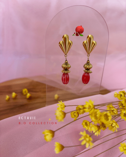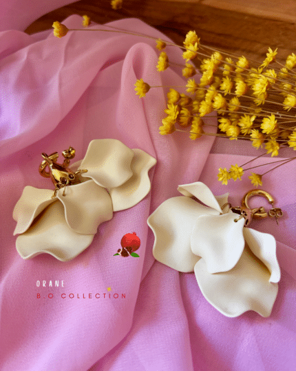 Boucle d'oreille de type pendente composée de plussieurs pétale de fleur colorés en jaune ou en rosse fuchsia