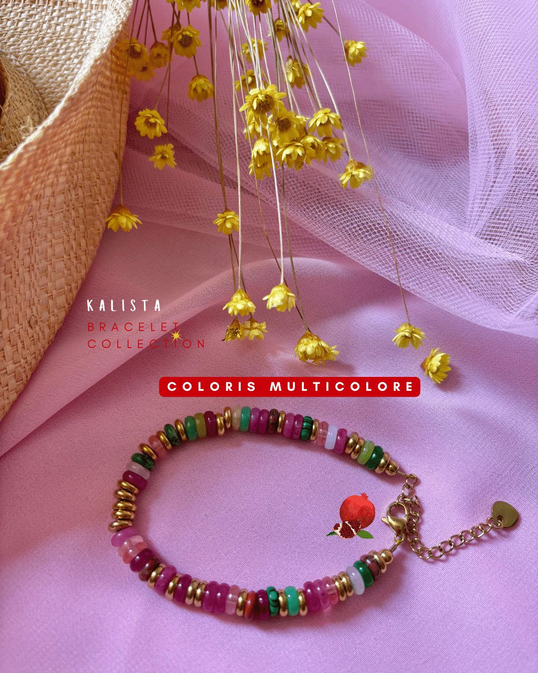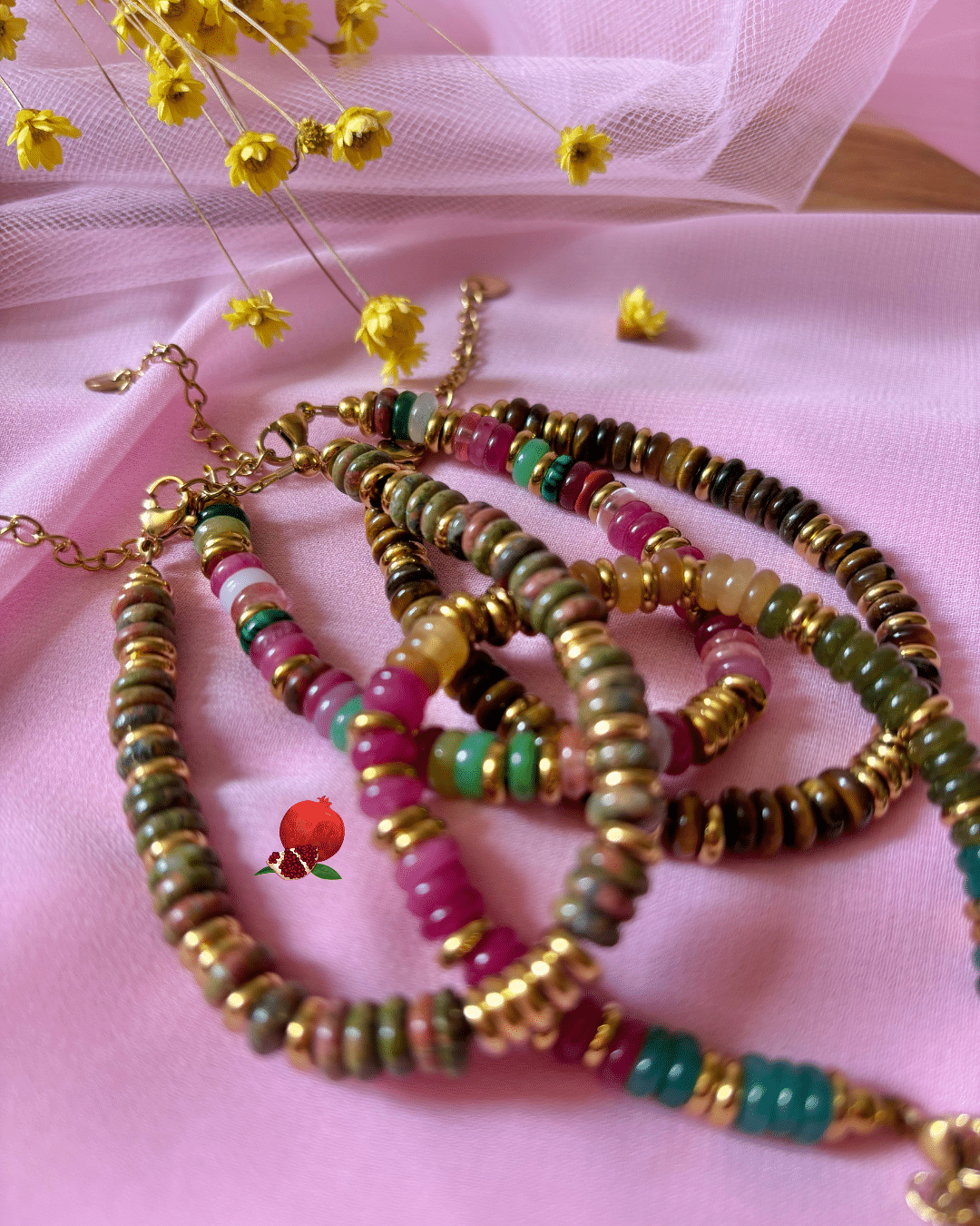 • Bracelet avec alternance de petites perles plates colorées en pierre naturelles et dorées en acier inoxydable